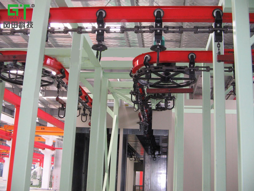 懸掛流水線是一種三維空間閉環(huán)連續(xù)輸送系統(tǒng),適用于車間內(nèi)部和車間之間成件物品的自動化輸送。根據(jù)輸送物料的方法,可分為通用和輕型的牽引式懸掛輸送、通用積放式的推勢懸掛輸送。